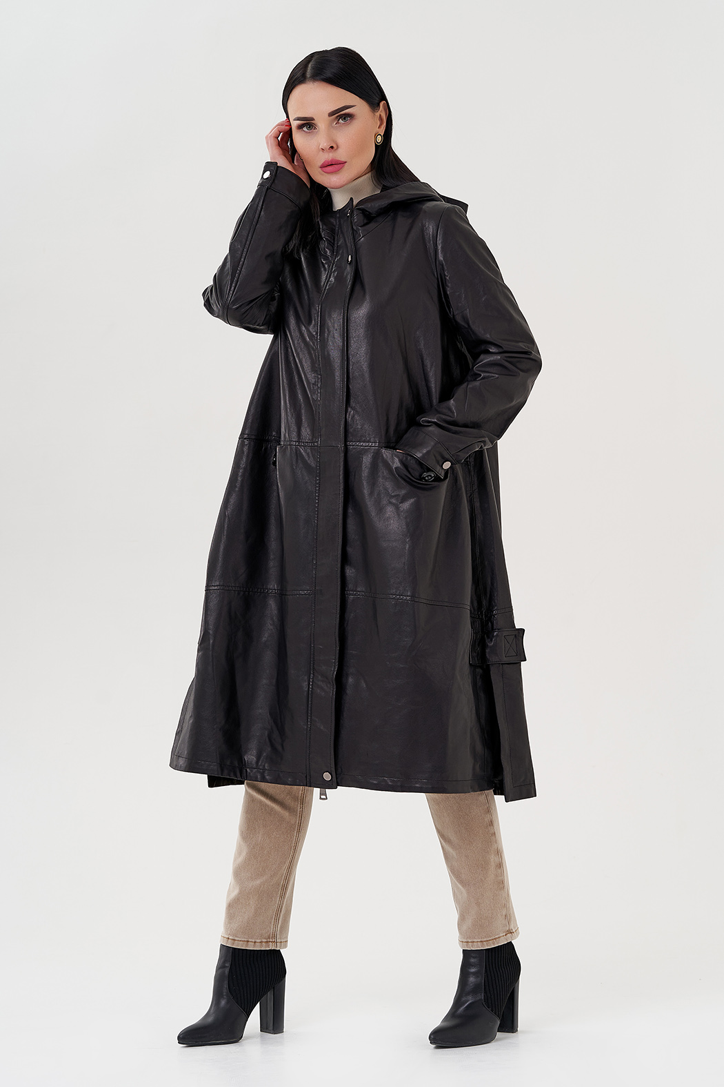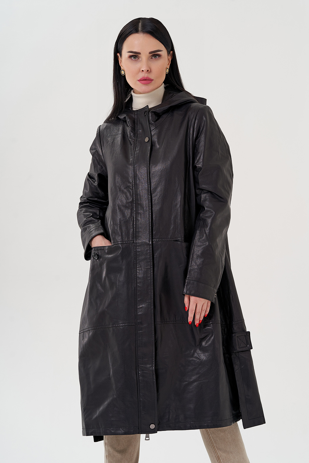 Длинный кожаный плащ с капюшоном