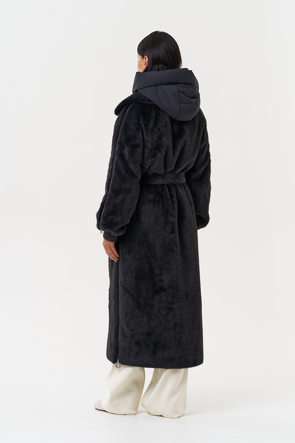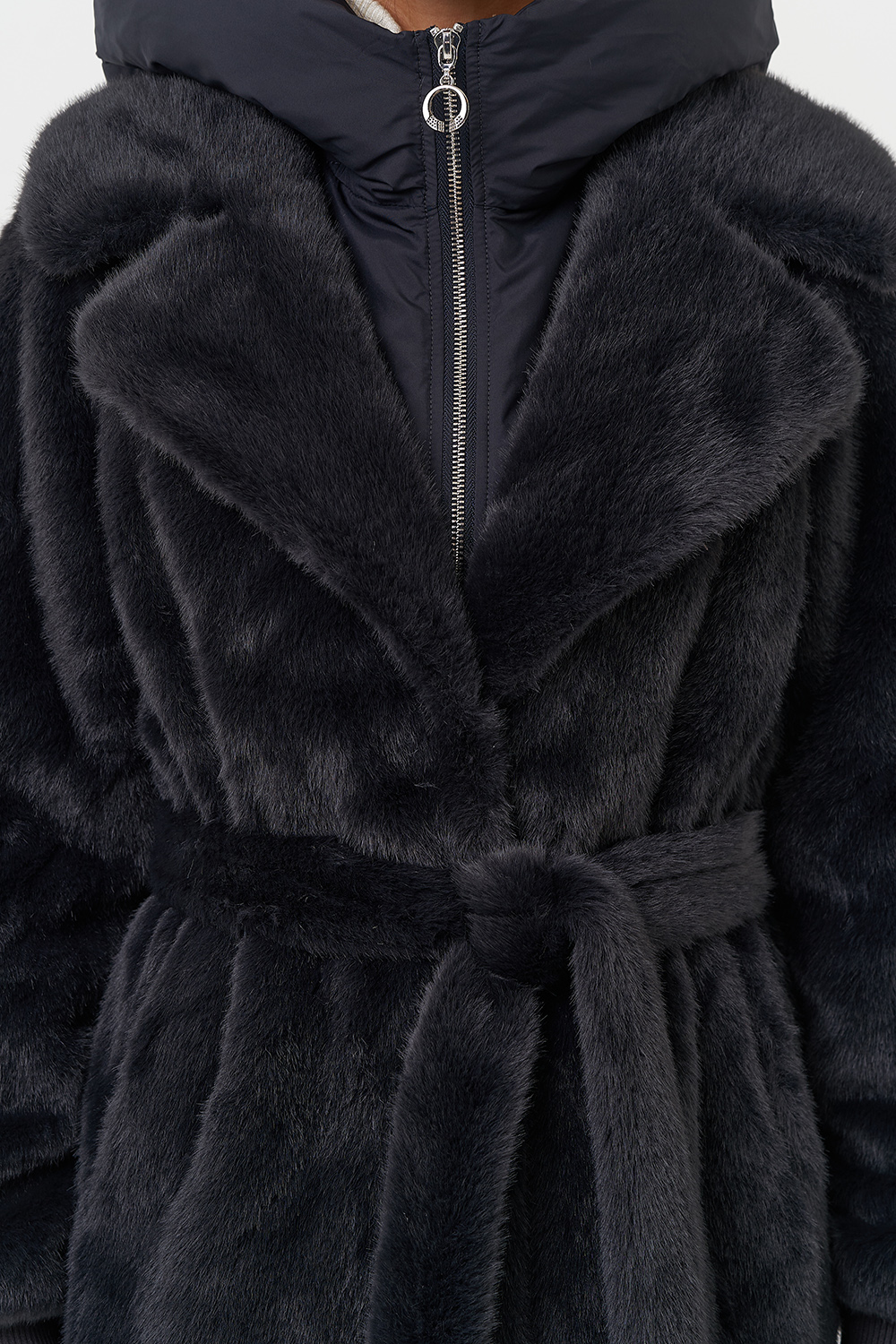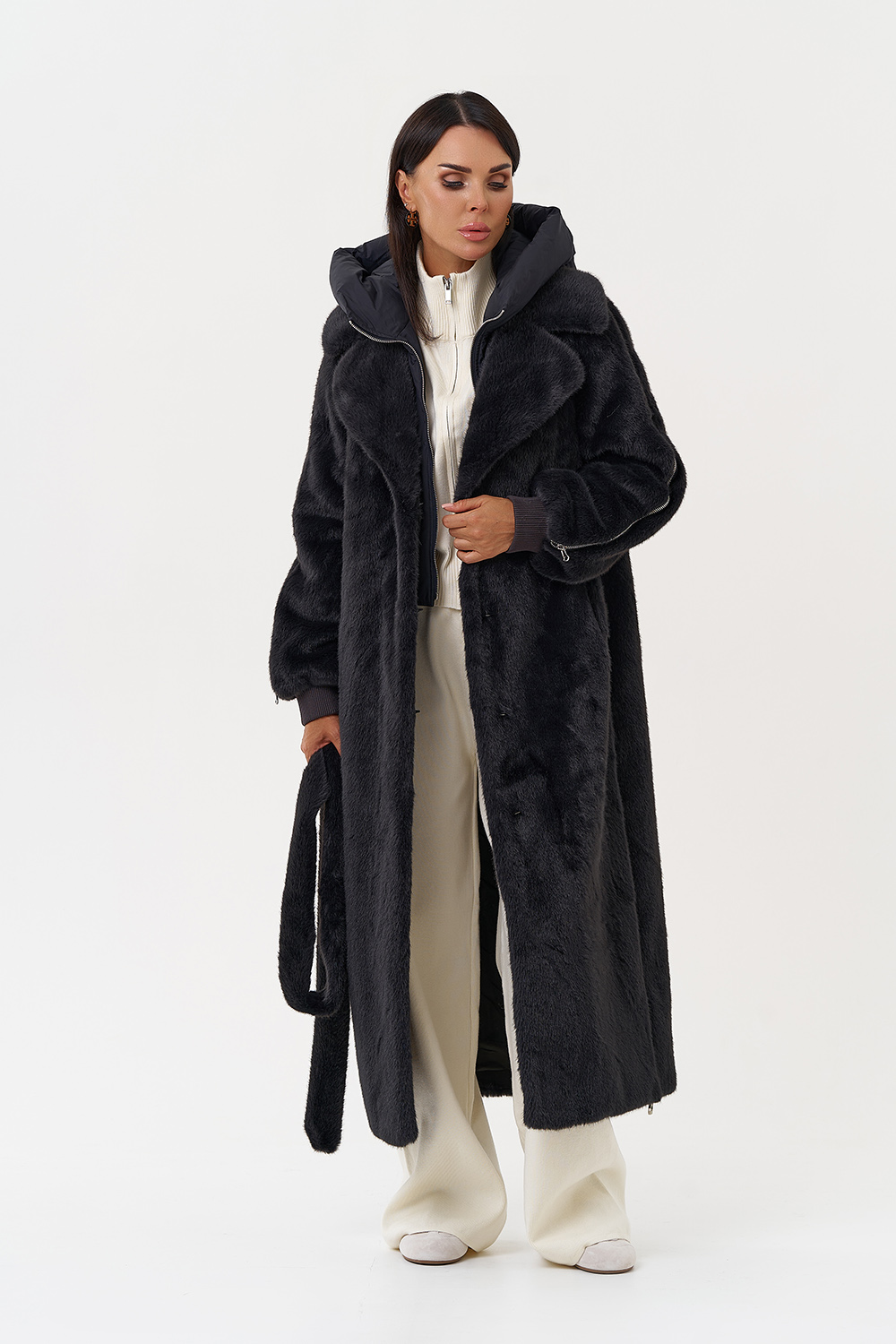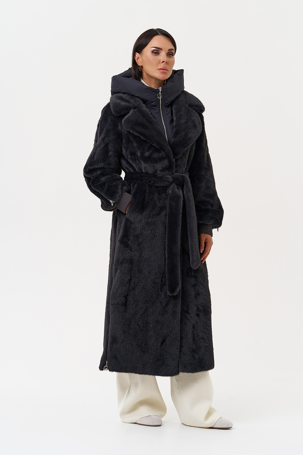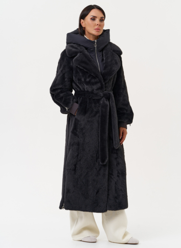 Фасон - прямой Длина изделия - 120 см Цвет - темно-серый (графит) Материал - экомех Состав полотна - полиэстер 100% Подкладка - полиэстер 100% Вид застежки - крючки, пояс Вид ворота - съёмный капюшон, английский воротник Фасон рукава - реглан, длинный |